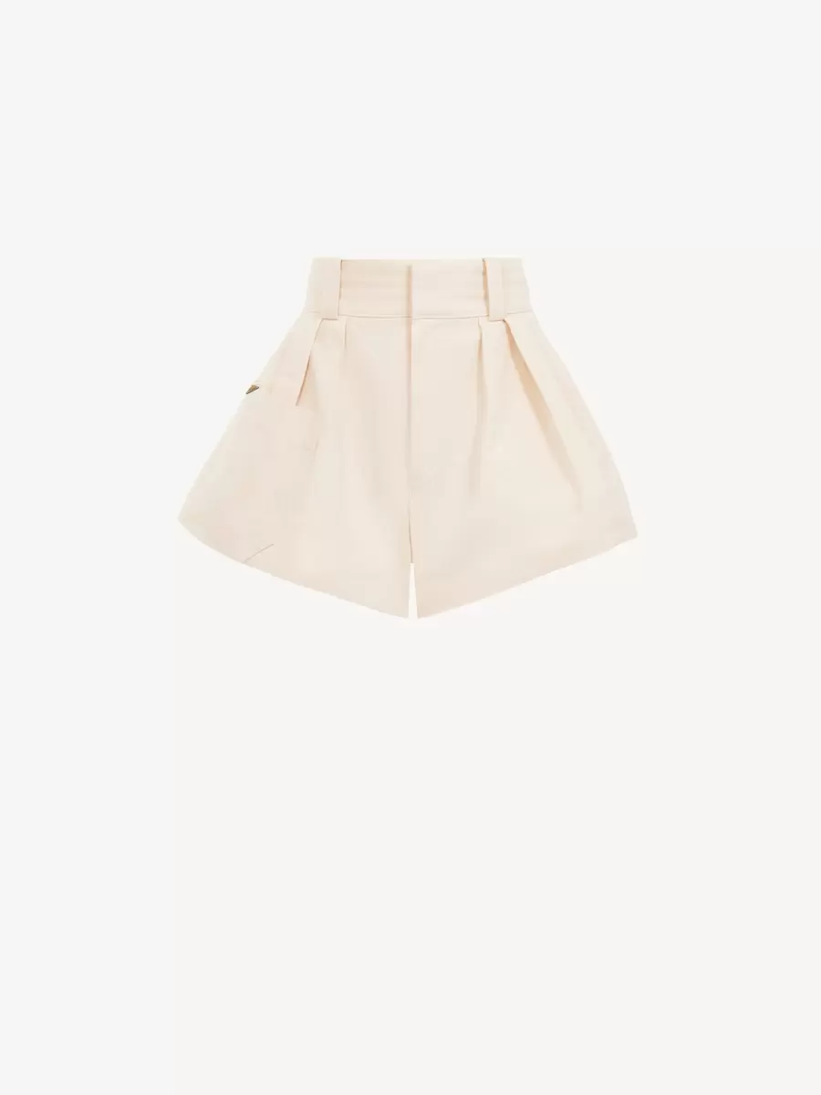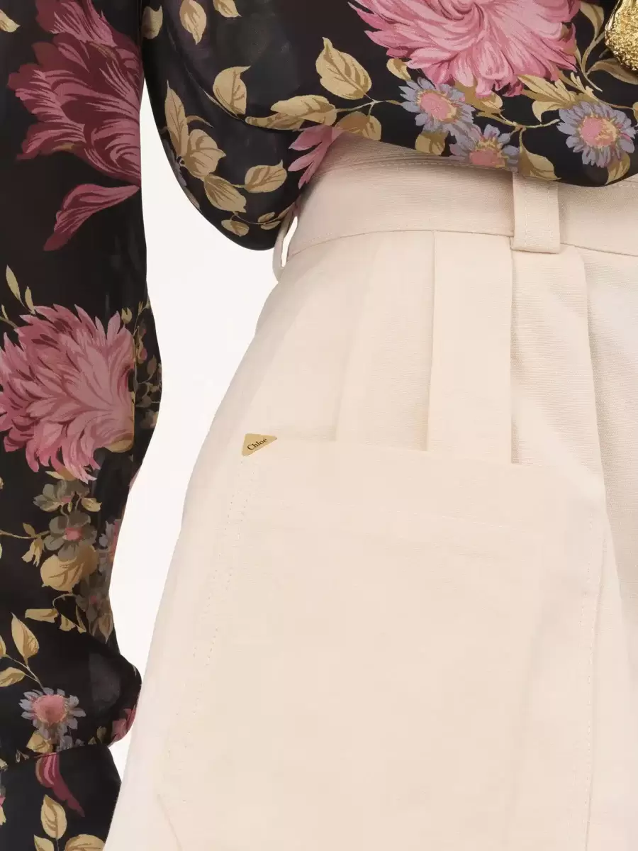 Pili ve altın rengi metal Chloé logosu üçgen detaylı asimetrik ön yama cepli, boyalı organik pamuklu kanvastan yüksek belli mini şort.