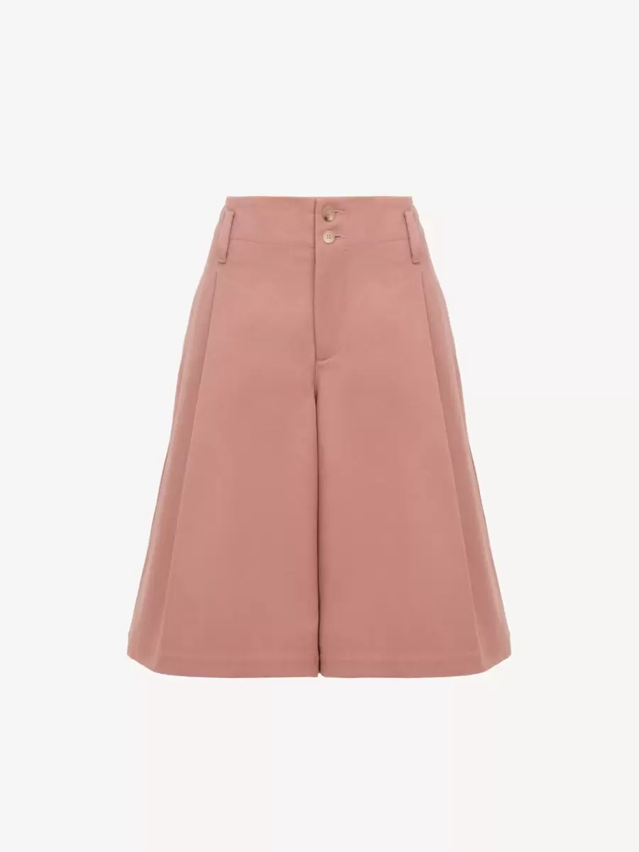 Ön pilili ve işlemeli boynuz düğmeli, organik pamuklu kumaştan yapılmış, yüksek belli, geniş paçalı Bermuda şort.