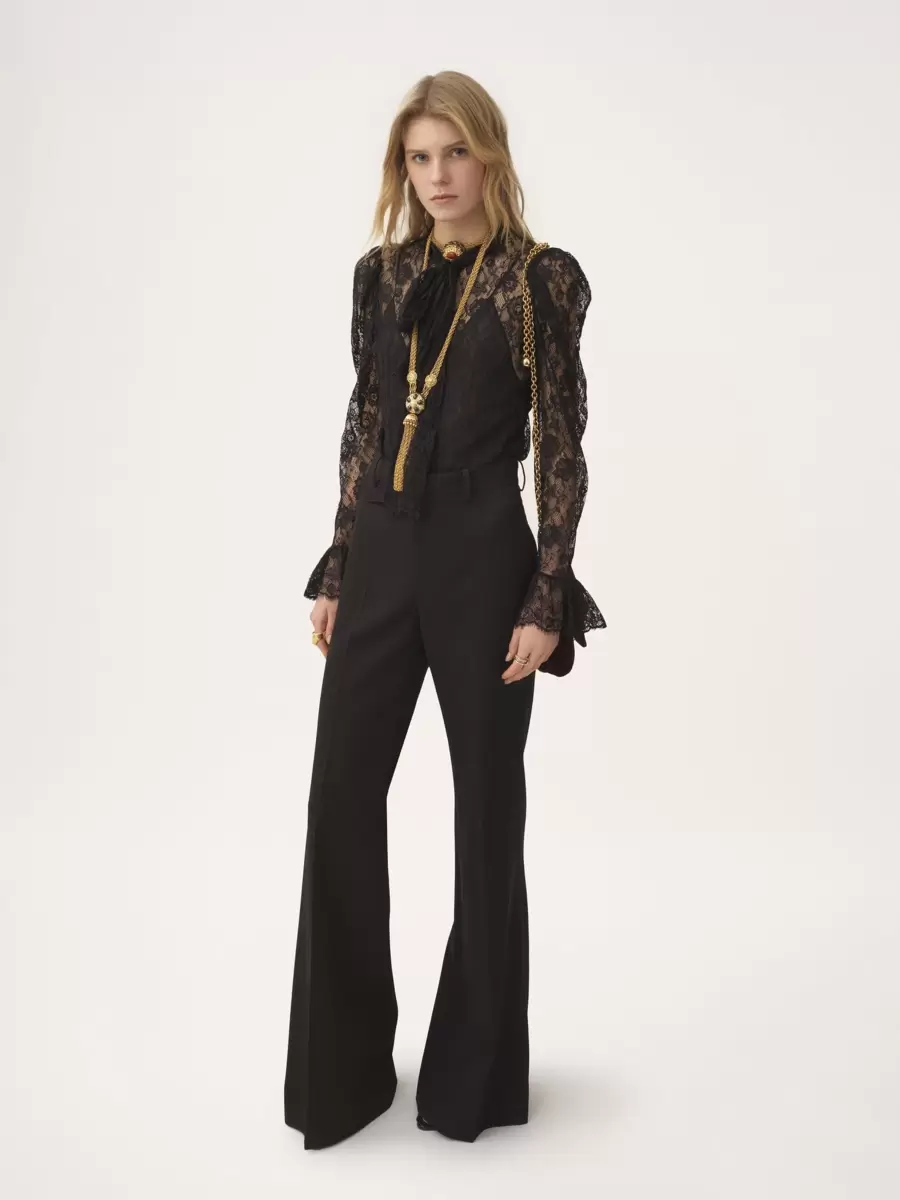Çiçekli dantel jakarlı uzun kollu lavallière üst, ayrı bir ipek karışımlı atlet astarı ile. Kabarık omuzlar, geniş manşetler ve sedef düğmeler bu parçayı tamamlıyor.