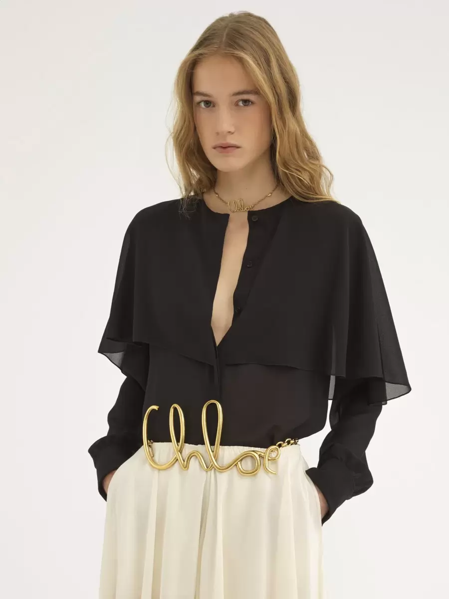 Organik ipek jorjet kumaştan, yuvarlak yakalı ve düğmeli manşetli pelerin bluz.