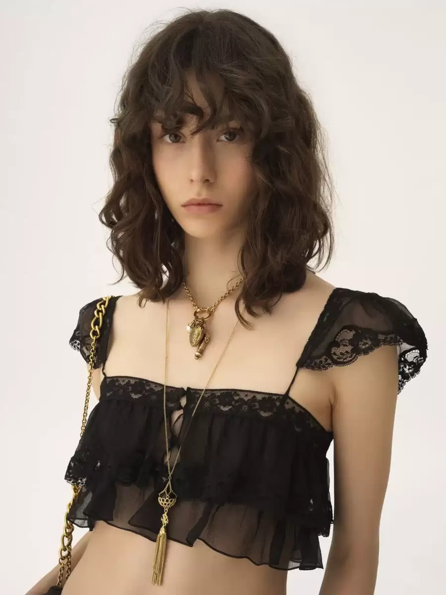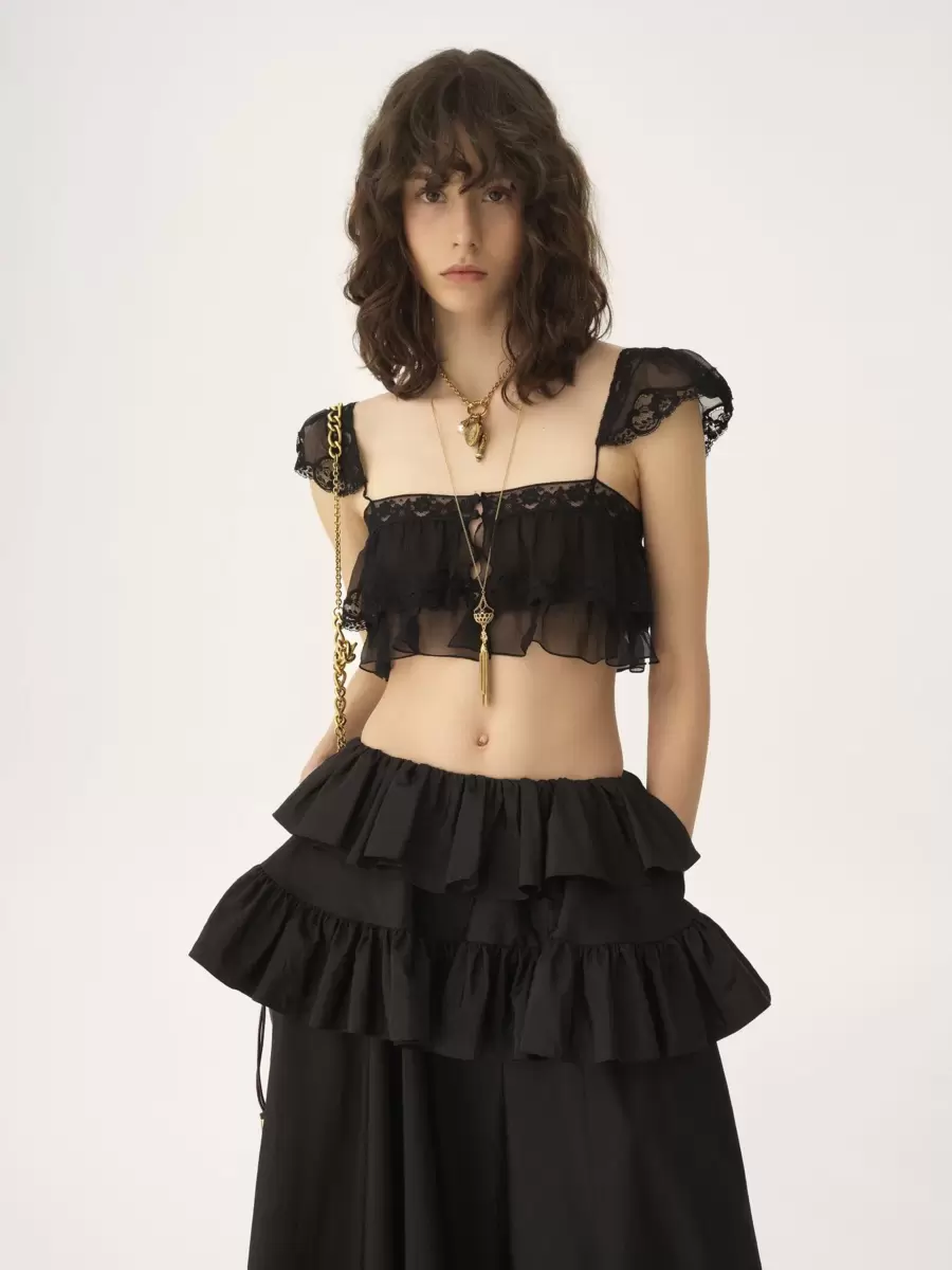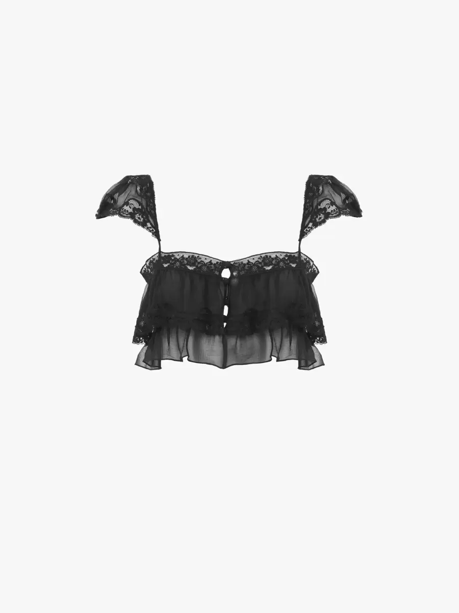 Dantel süslemeli, kısa kollu ve kumaş kaplı düğmeli, organik ipek muselinden yapılmış akışkan fırfırlı bralet.