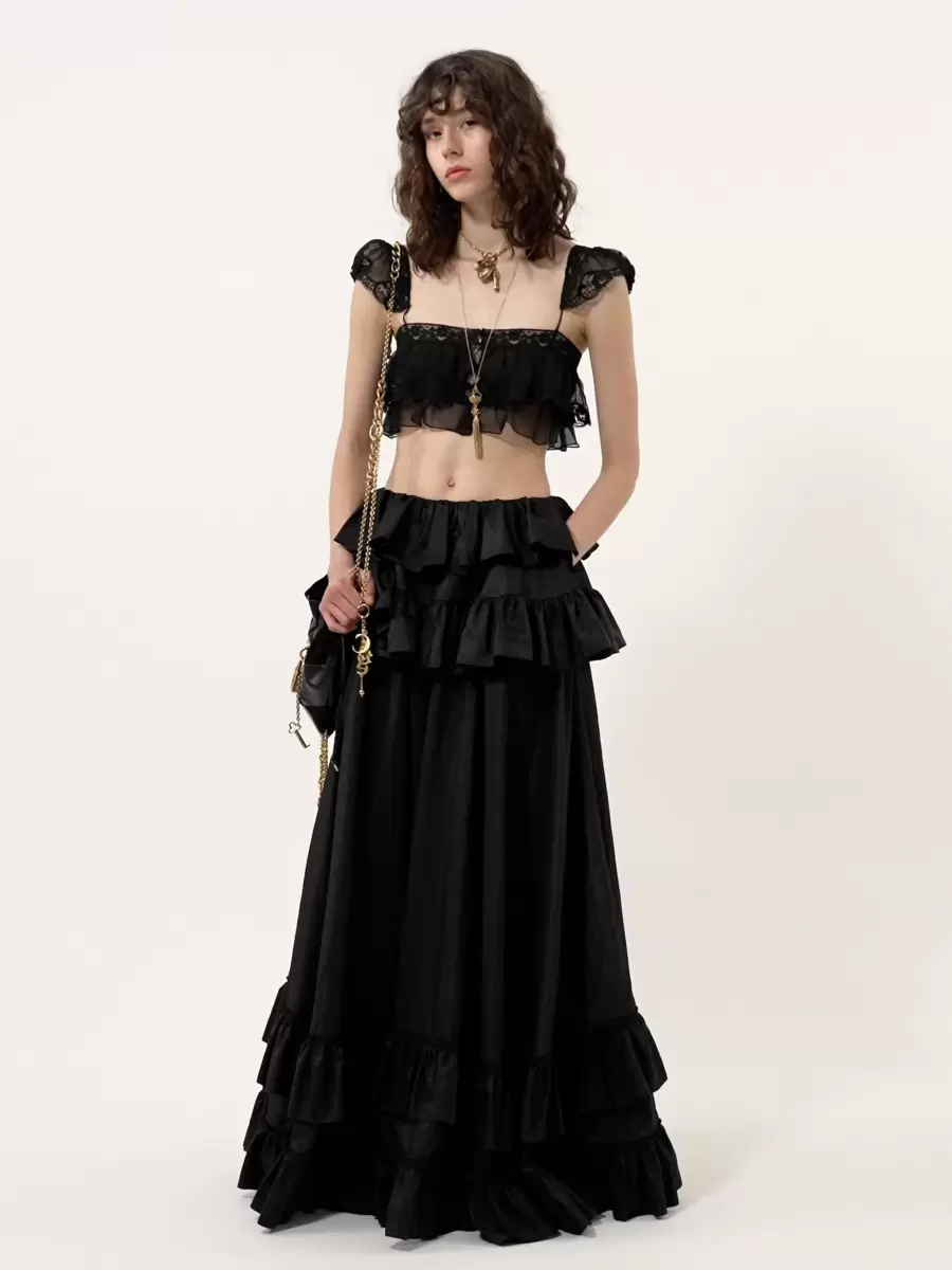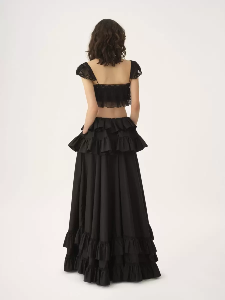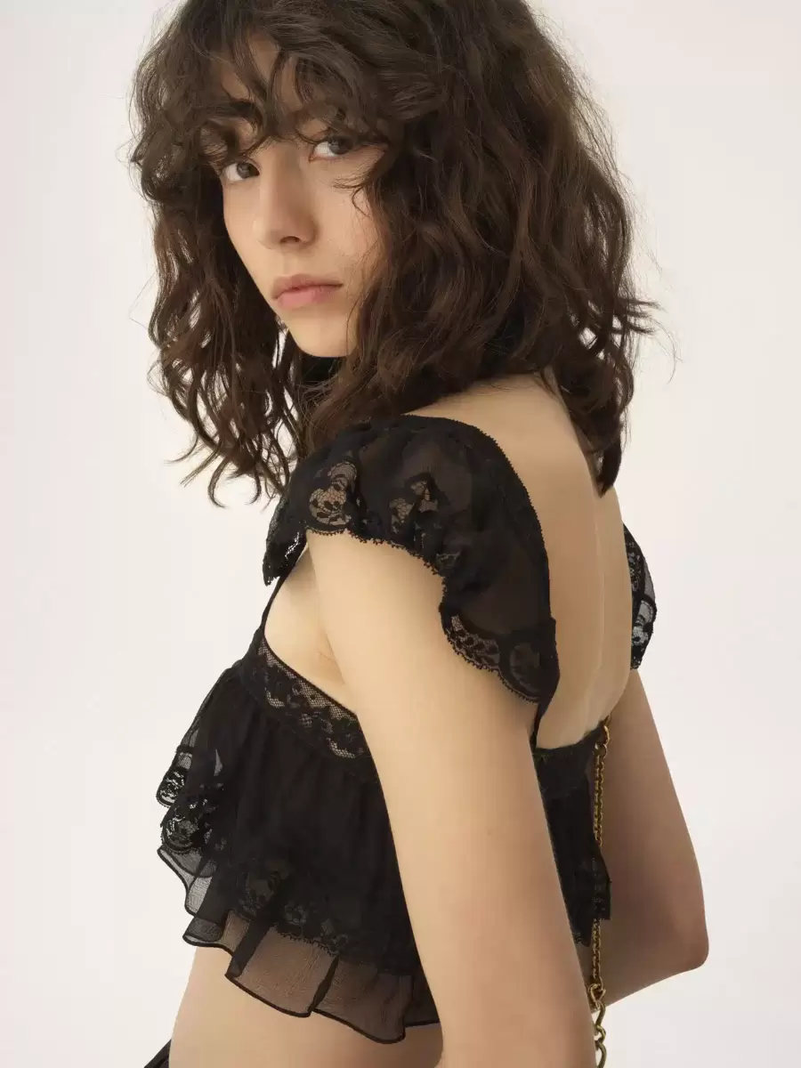 Dantel süslemeli, kısa kollu ve kumaş kaplı düğmeli, organik ipek muselinden yapılmış akışkan fırfırlı bralet.