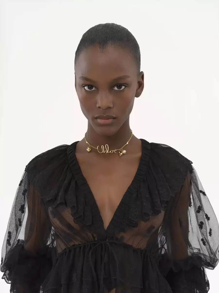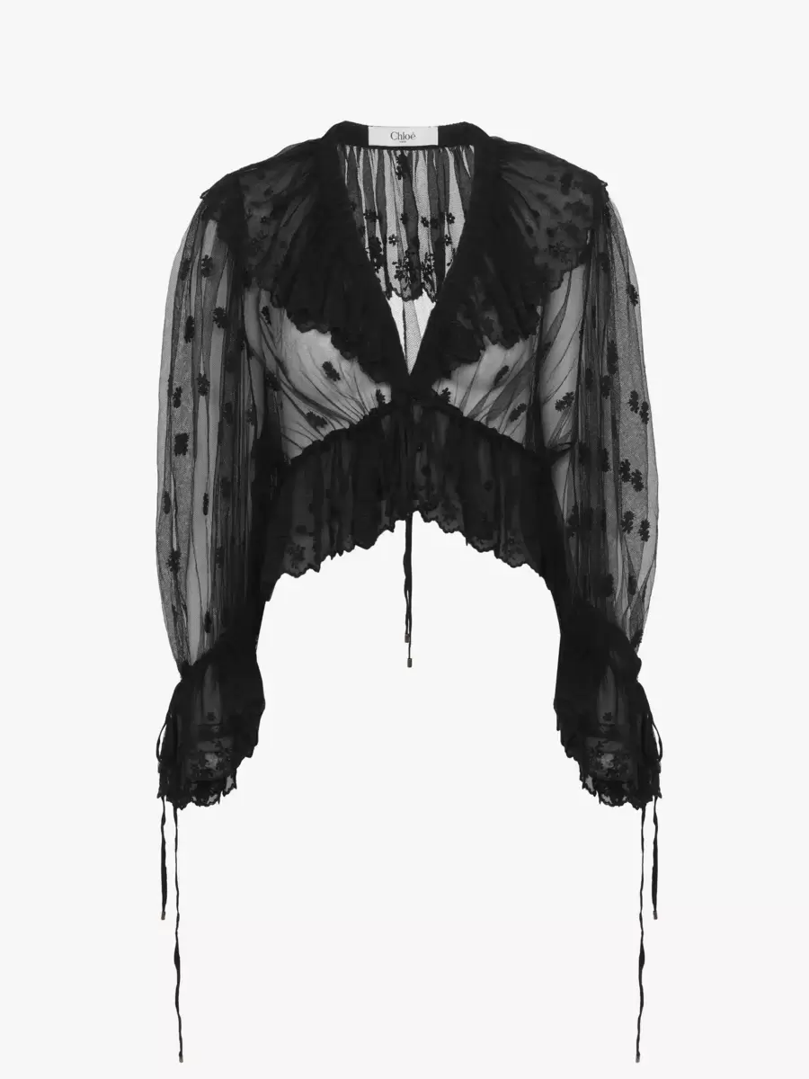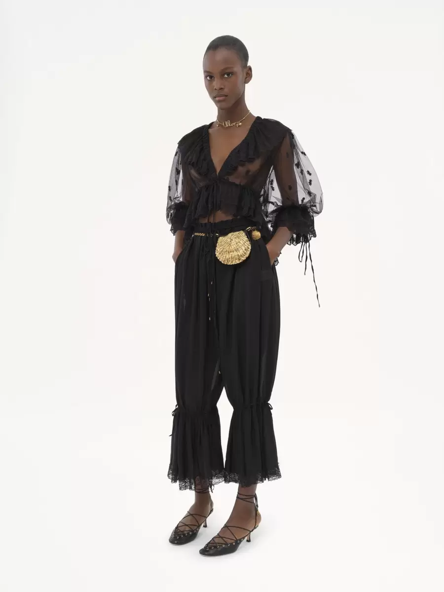 Maison’un mirasından ilham alan işlemeli dantelden yapılmış V yakalı fırfırlı üst. Toplanmış silüet, fırfırlı kenarlara ve altın tonlarında metal uçlu büzgülü bağlara sahiptir.