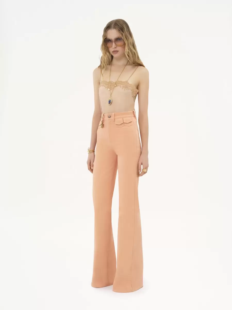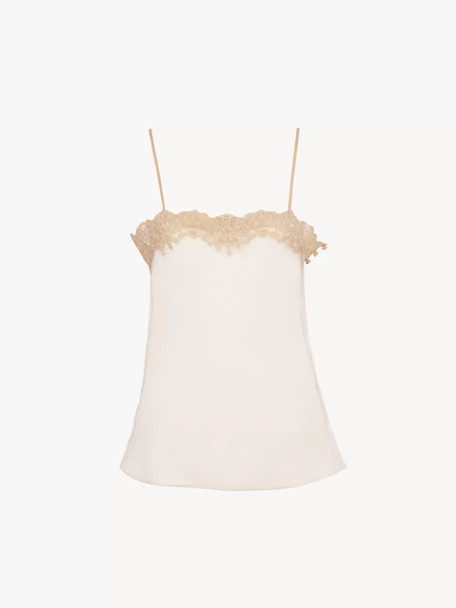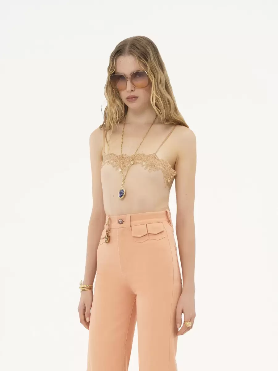 İnce askılı, işlemeli dantel ve yanlarda kumaş kaplı düğmelere sahip, şeffaf viskon karışımından yapılmış, vücuda oturan atlet.