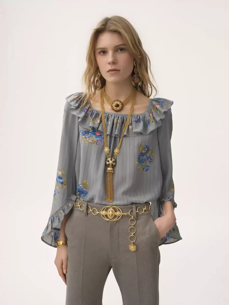 Çizgili çiçek desenli organik ipek krep de şin kumaştan kare yaka fırfırlı üst, maksi kollar ve yaka ile manşetlerde fırfırlı süslemeler içeriyor.