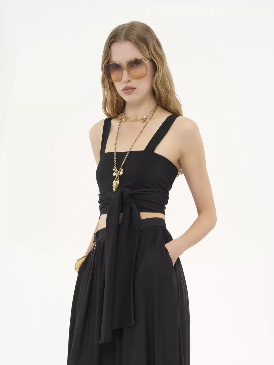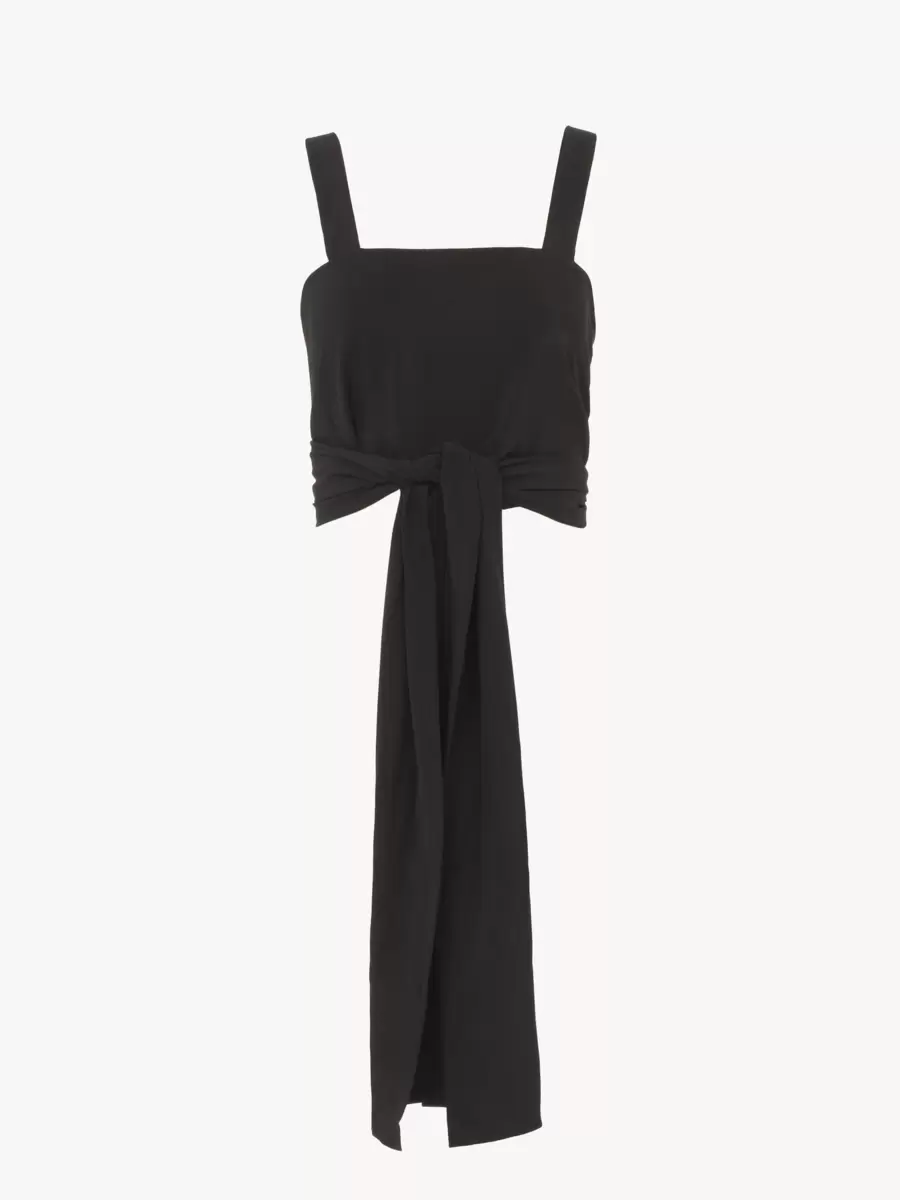 Kare yakalı, önden bağcıklı, organik ipek krep de şin kumaştan kısa üst.