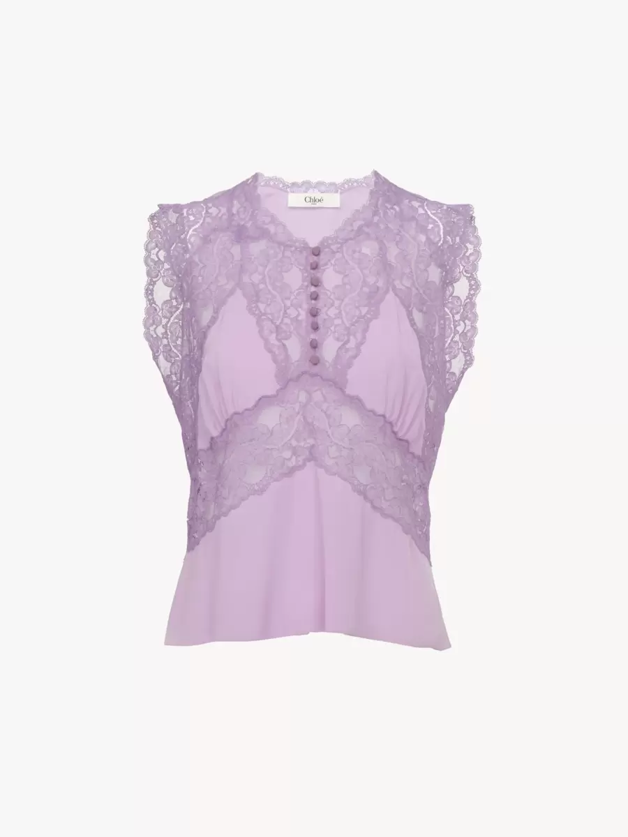 Tonlu dantel ekleri ve kumaş kaplı düğmeleri olan organik ipek krep de şin V yakalı üst.