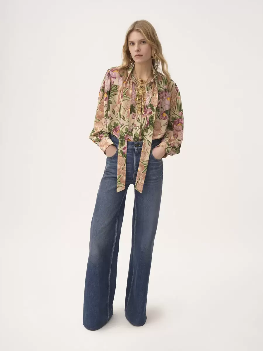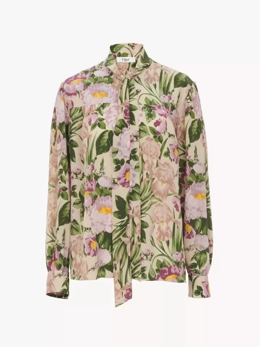 Çiçek desenli ve akıcı silüetli organik ipek krep de şin kumaştan maksi büzgülü lavallière bluz.