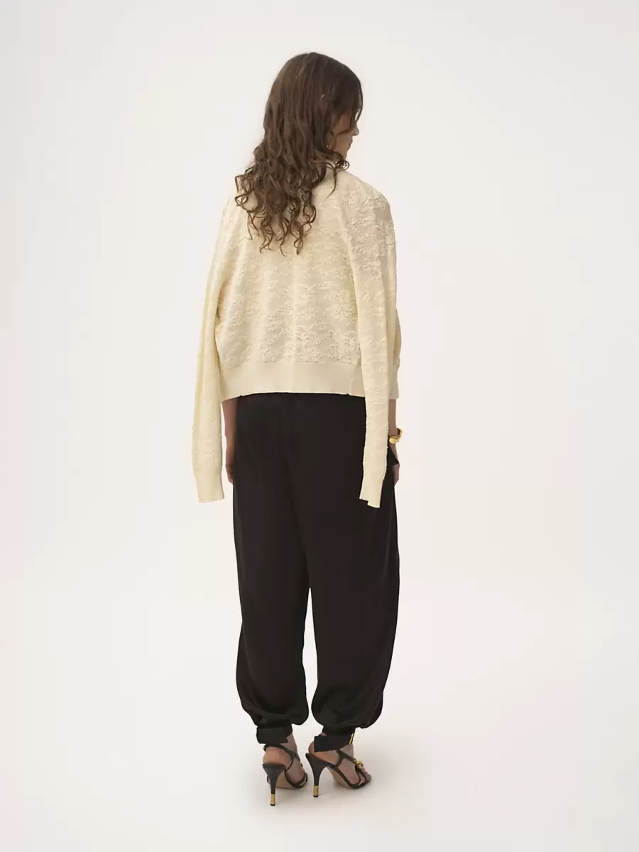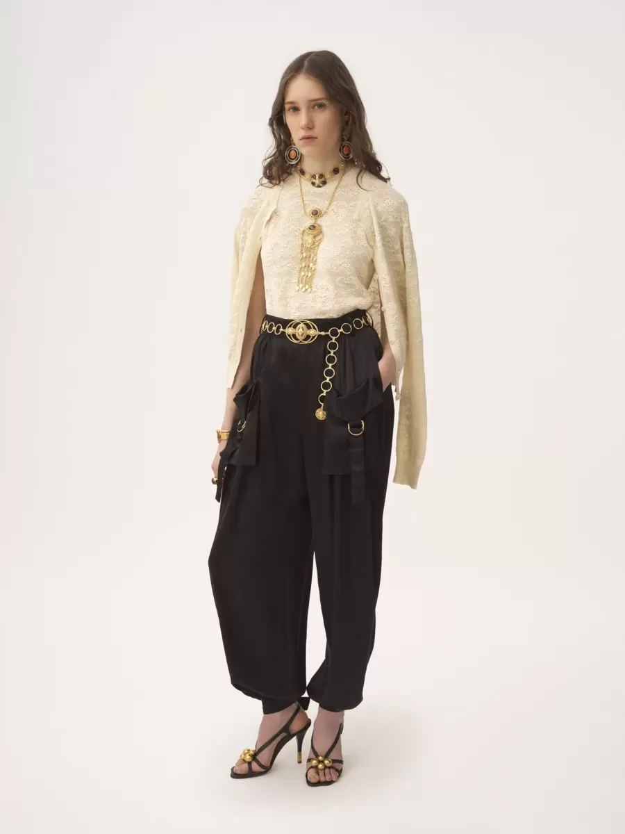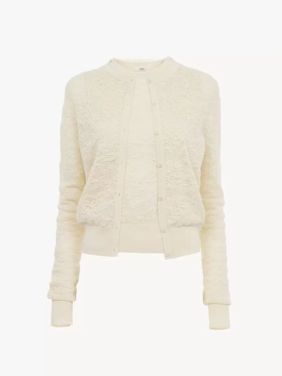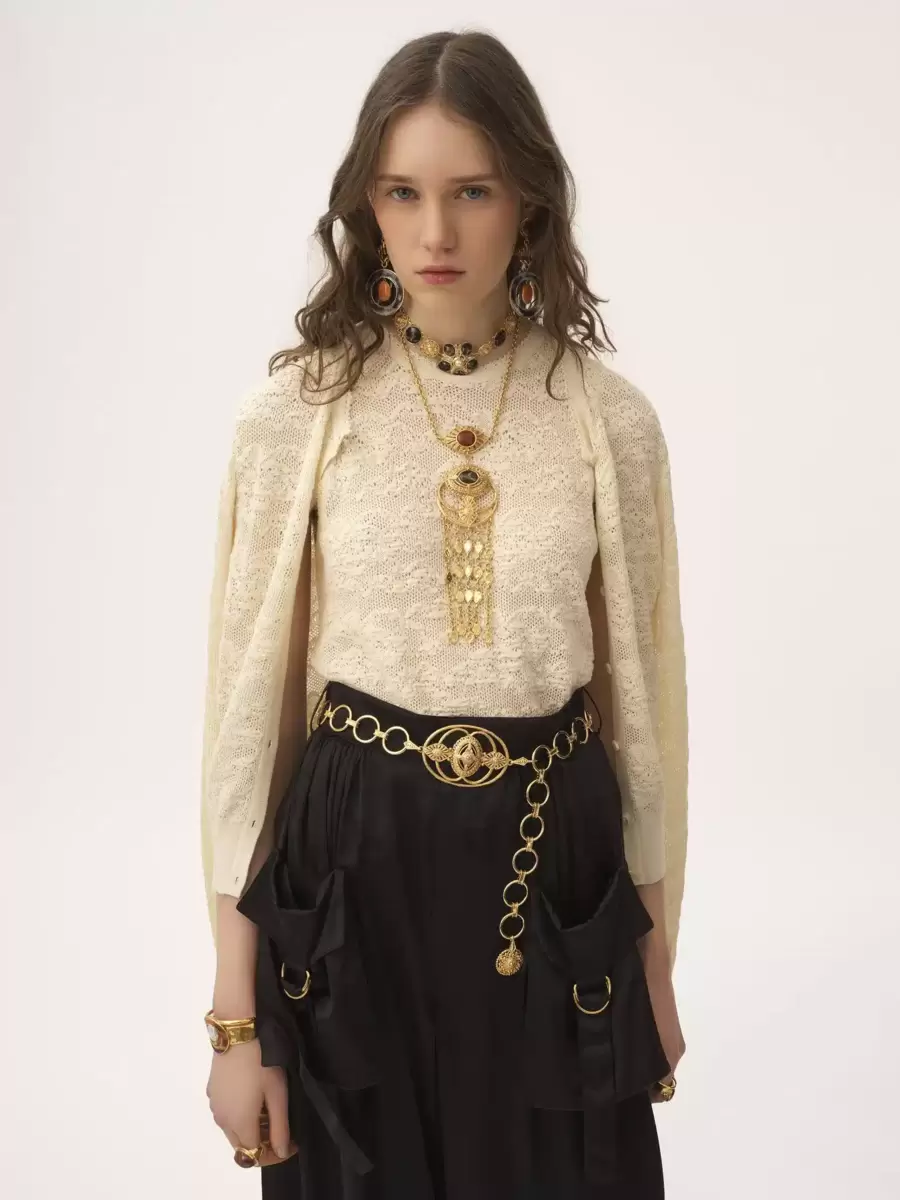 Pamuk ve ipek örgüden, dantel efektli dikişlere ve nervürlü süslemelere sahip, yuvarlak yakalı atlet ve hırkadan oluşan ikili takım. Hırkanın detaylarında sedef düğmeler bulunurken, her iki parçanın da arkası aynı tonda Chloé logosuyla işaretlenmiştir.