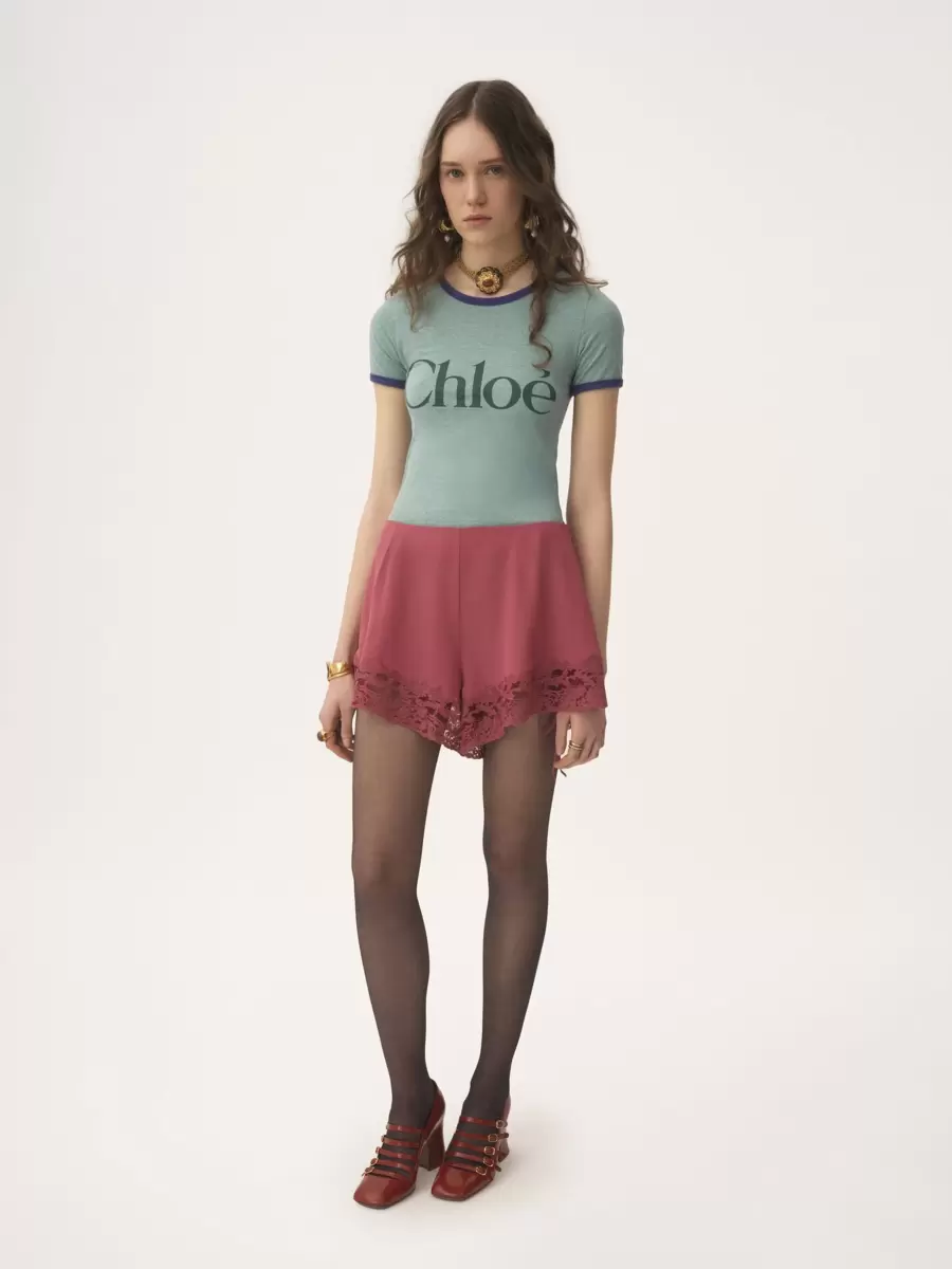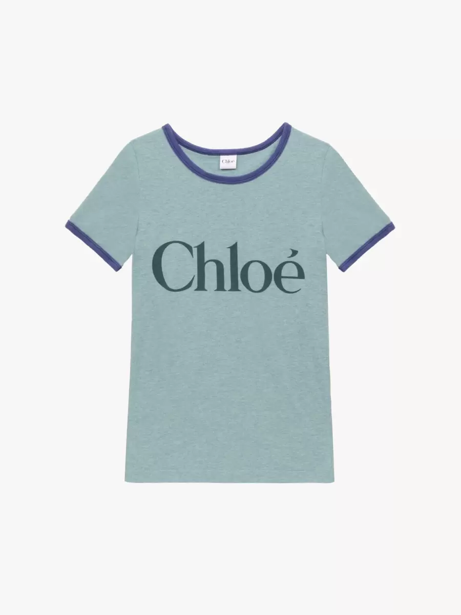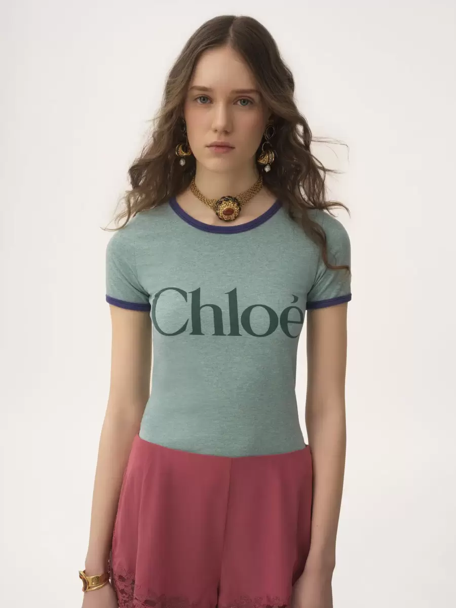 Pamuk karışımlı çine jarse kumaştan, yuvarlak yakalı, büyük Chloé logosu baskısı ve kontrast ribanalı süslemelere sahip, vücuda oturan tişört.