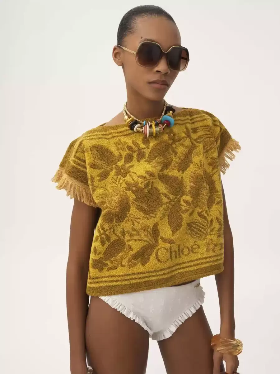 Çiçek desenli ve Chloé logosu bulunan, ham kenarlı, pamuklu jakarlı tekne yaka üst.