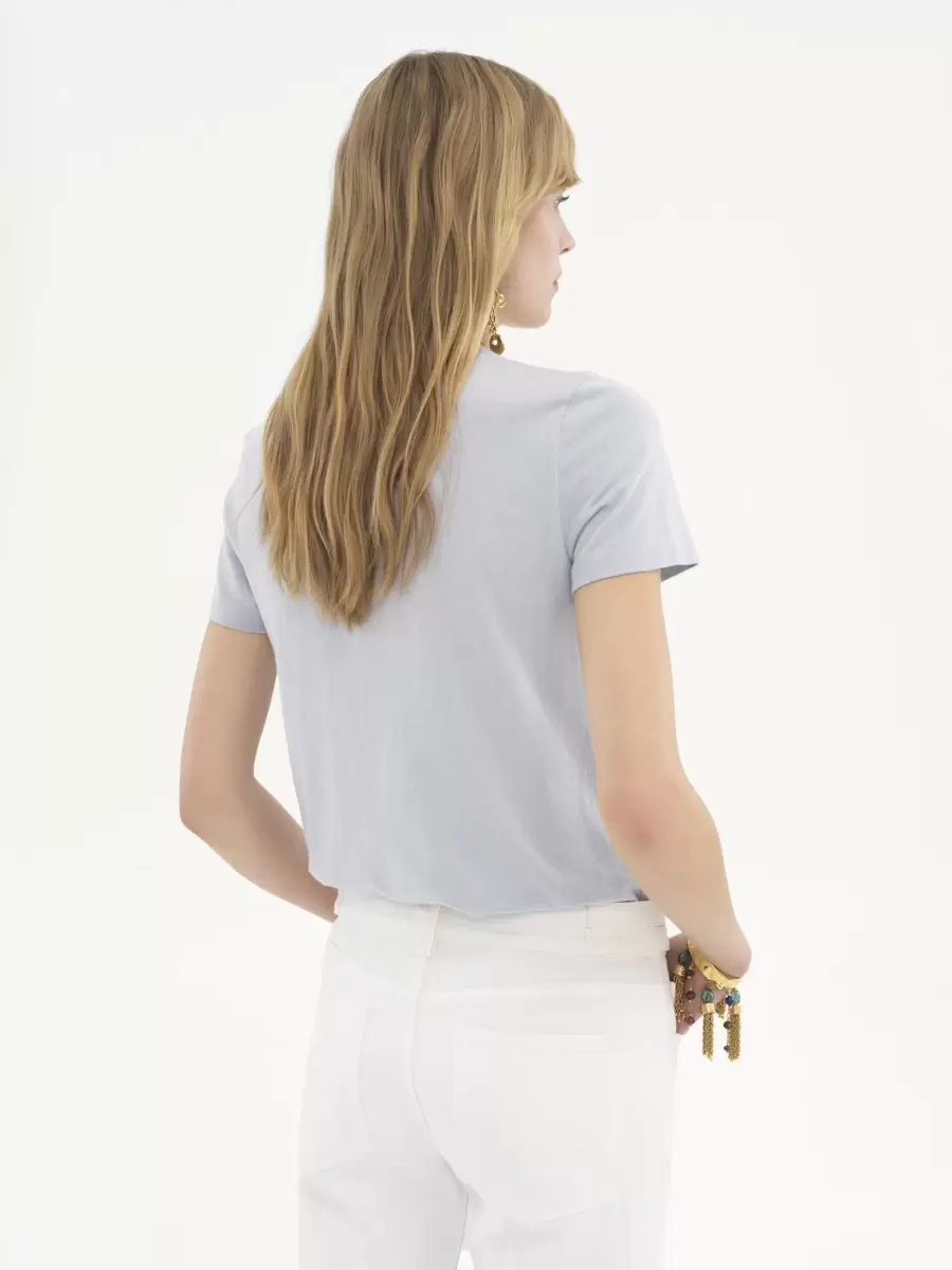 Hafif organik pamuklu jarse kumaştan, kontrast Oğlak Chloé baskılı, yuvarlak yakalı bebek tişörtü.