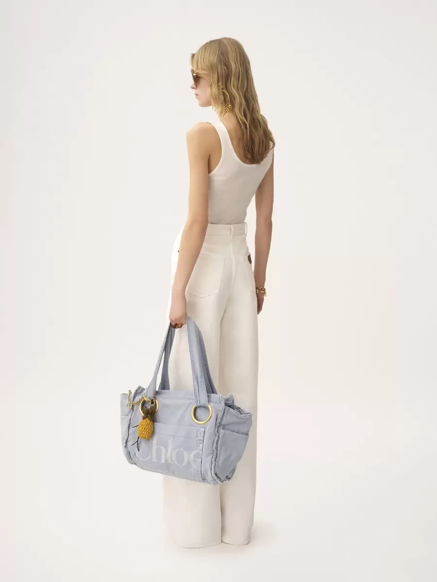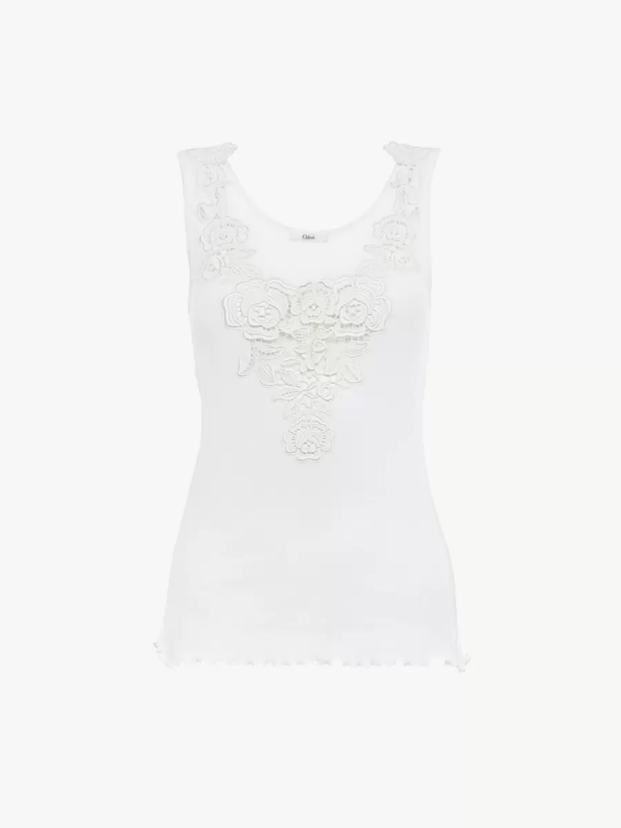 Boyun ve omuzlar boyunca gipür işlemeli, organik pamuklu jarse kumaştan, vücuda oturan atlet.