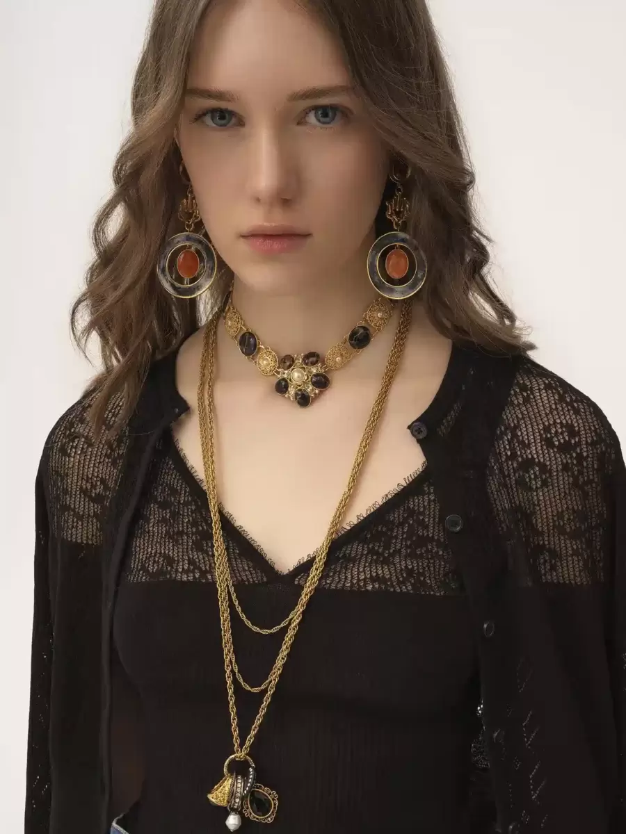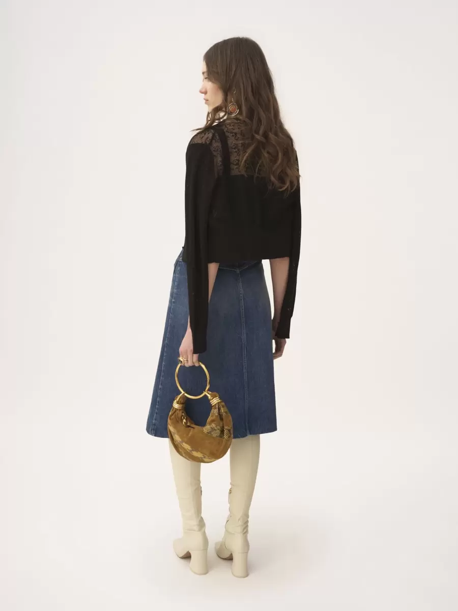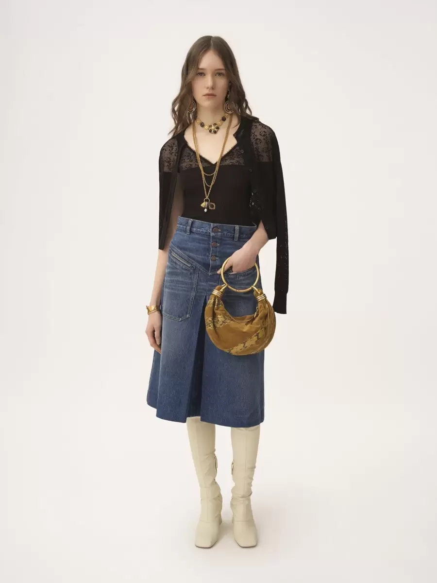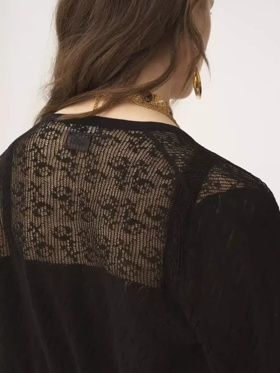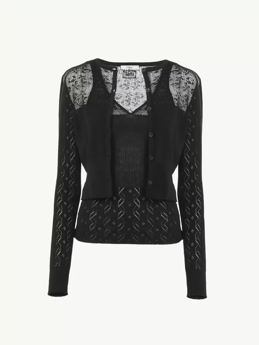 Dantel efektli dikişlere ve nervürlü kenarlara sahip pamuklu delikli örgüden atlet ve hırkadan oluşan ikili takım. Hırkanın detayları sedef düğmelerle süslenmişken, her iki parçanın arkası Chloé logo yaması ile işaretlenmiştir.