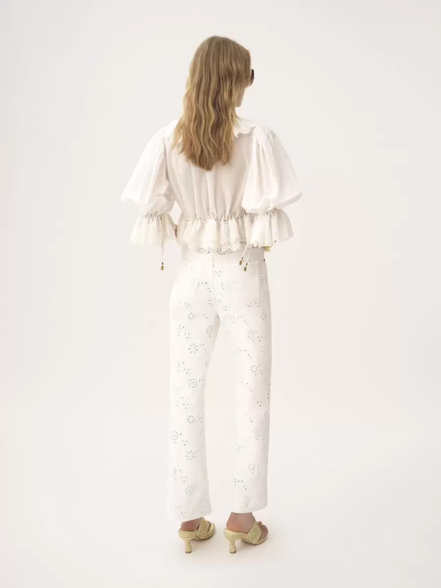 Çiçek nakışlı, derin V yakalı, fırfırlı süslemeli ve altın tonlarında metal uçlu ve ananas süslemeli sallantılı bağcıklı organik pamuklu vual kumaştan fırfırlı üst.