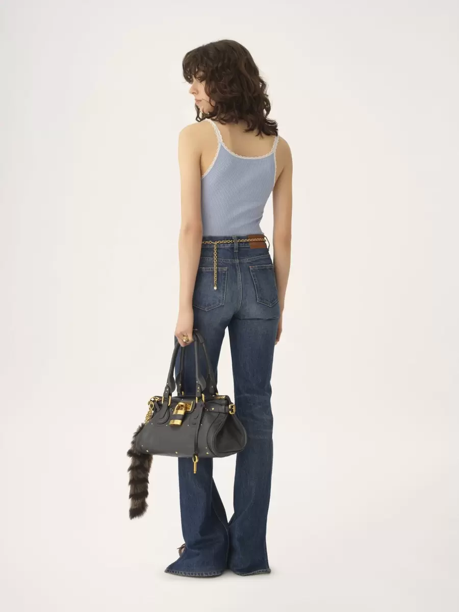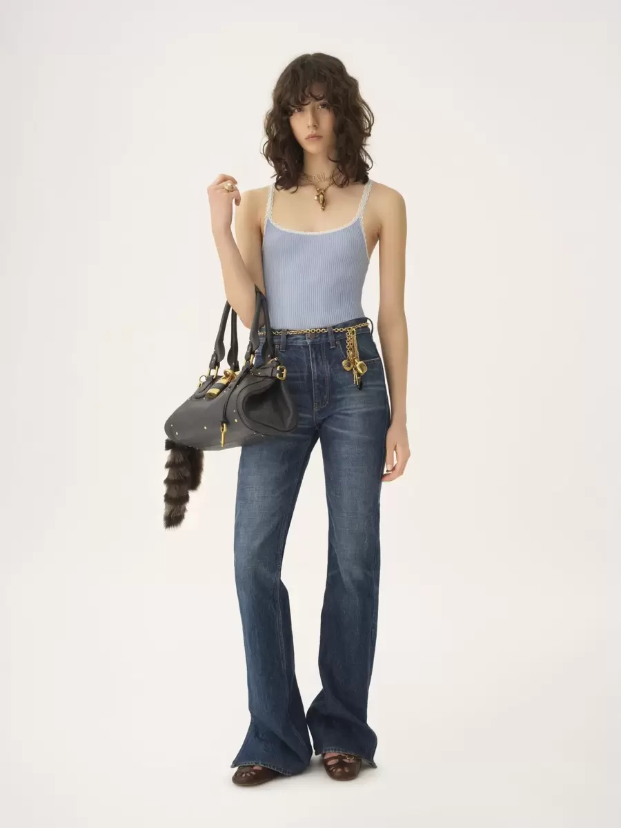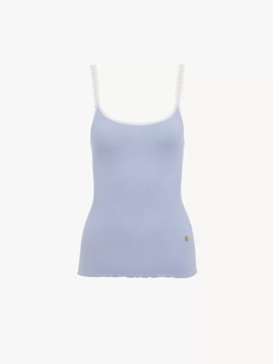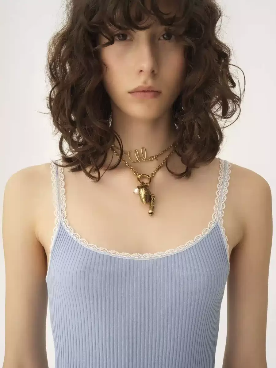 Tübüler pamuklu kumaştan, taraklı dantel süslemeli ve kalçada altın rengi madalyonlu, vücuda oturan atlet.
