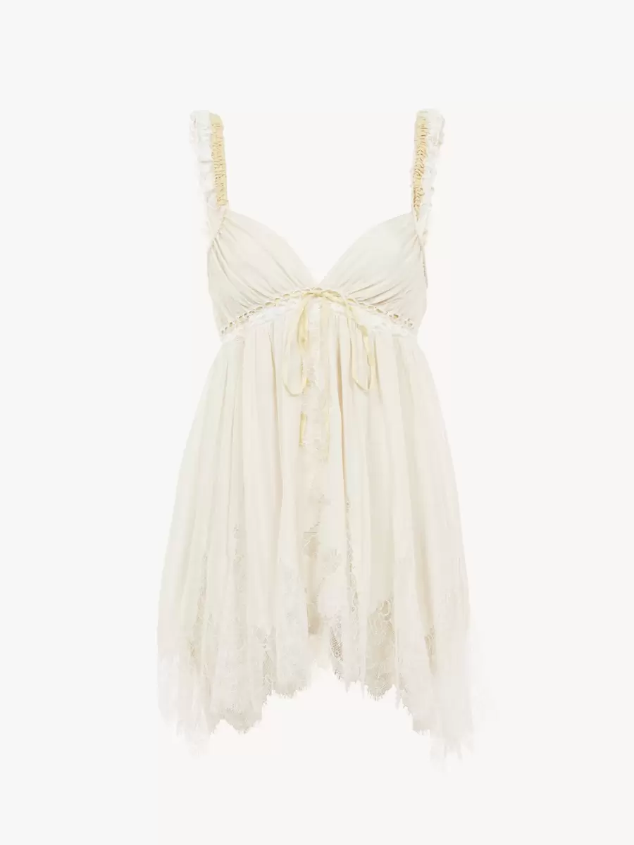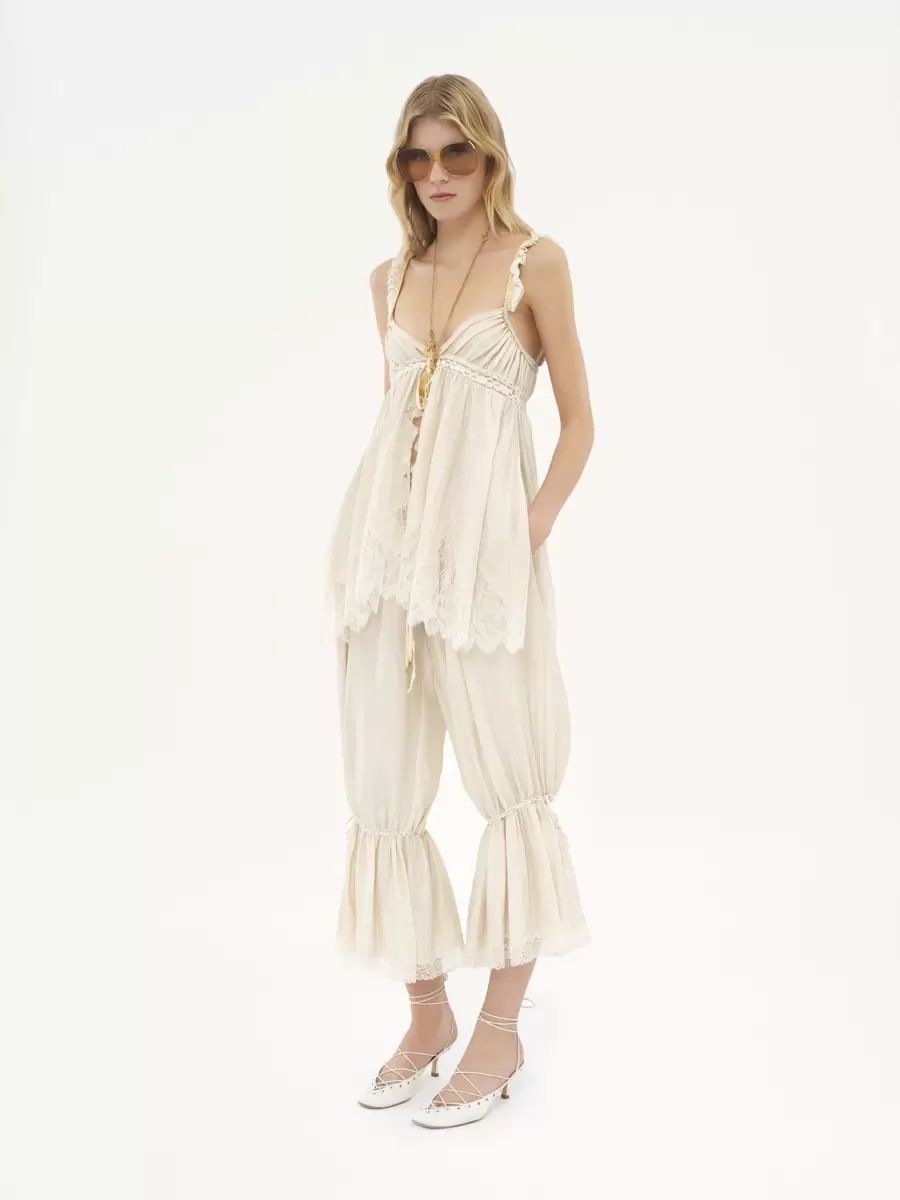 İnce askılı, bağcıklı imparatorluk bel ve dantel süslemeli, yıkanmış ipek ponje kumaştan kolsuz üst.