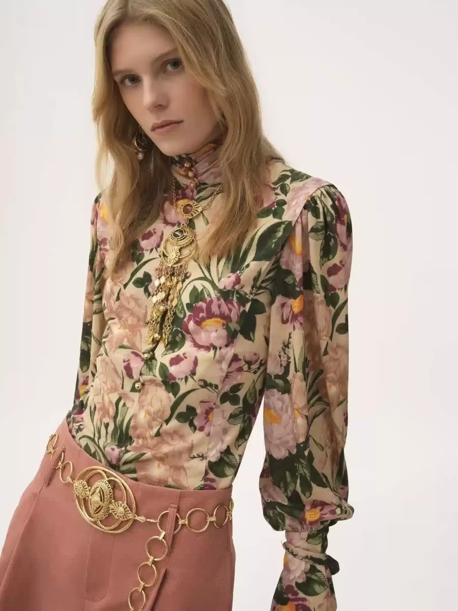 Çiçek desenli yün jarse kumaştan, altın tonlarında küre düğmeler, büzgülü omuzlar ve manşetlerde düğümlü bağcıklar bulunan, dar kesim balıkçı yaka üst.