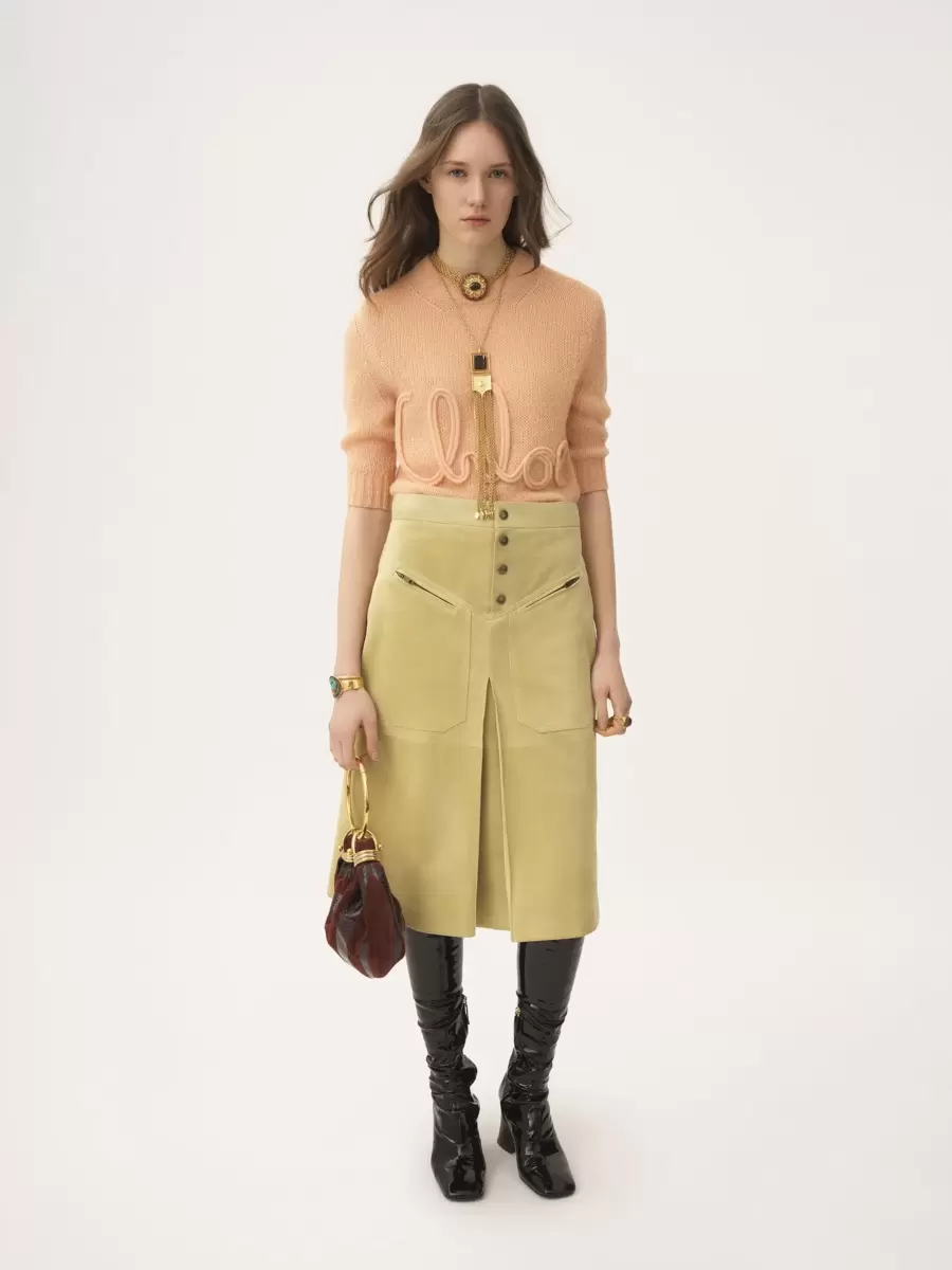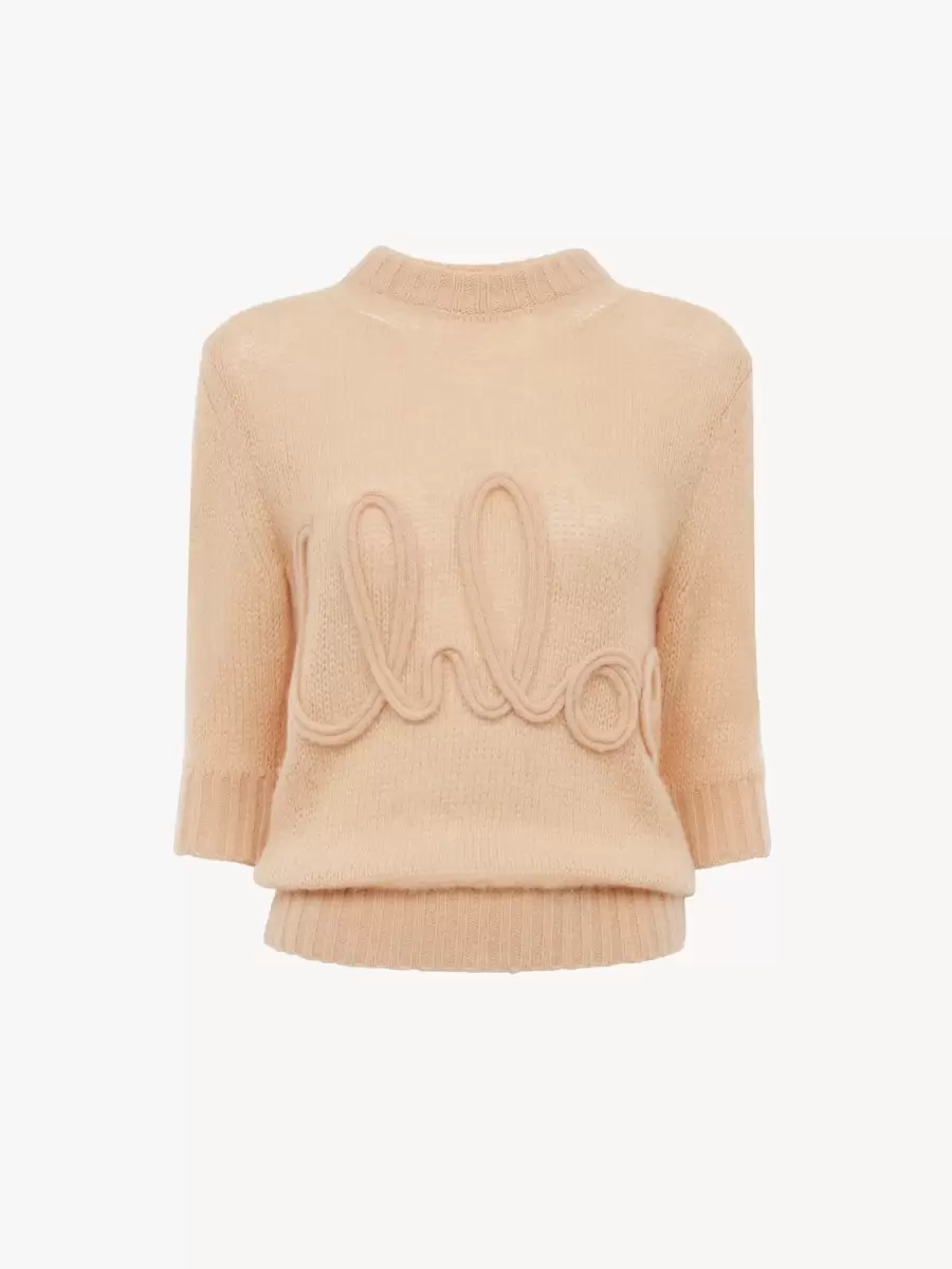Alpaka yünü ve ipek örgüden yapılmış, yuvarlak yakalı, dirsek kollu kazak, ön kısmında nervürlü süslemeler ve büyük Chloé logosu işlemeleriyle detaylandırılmıştır.