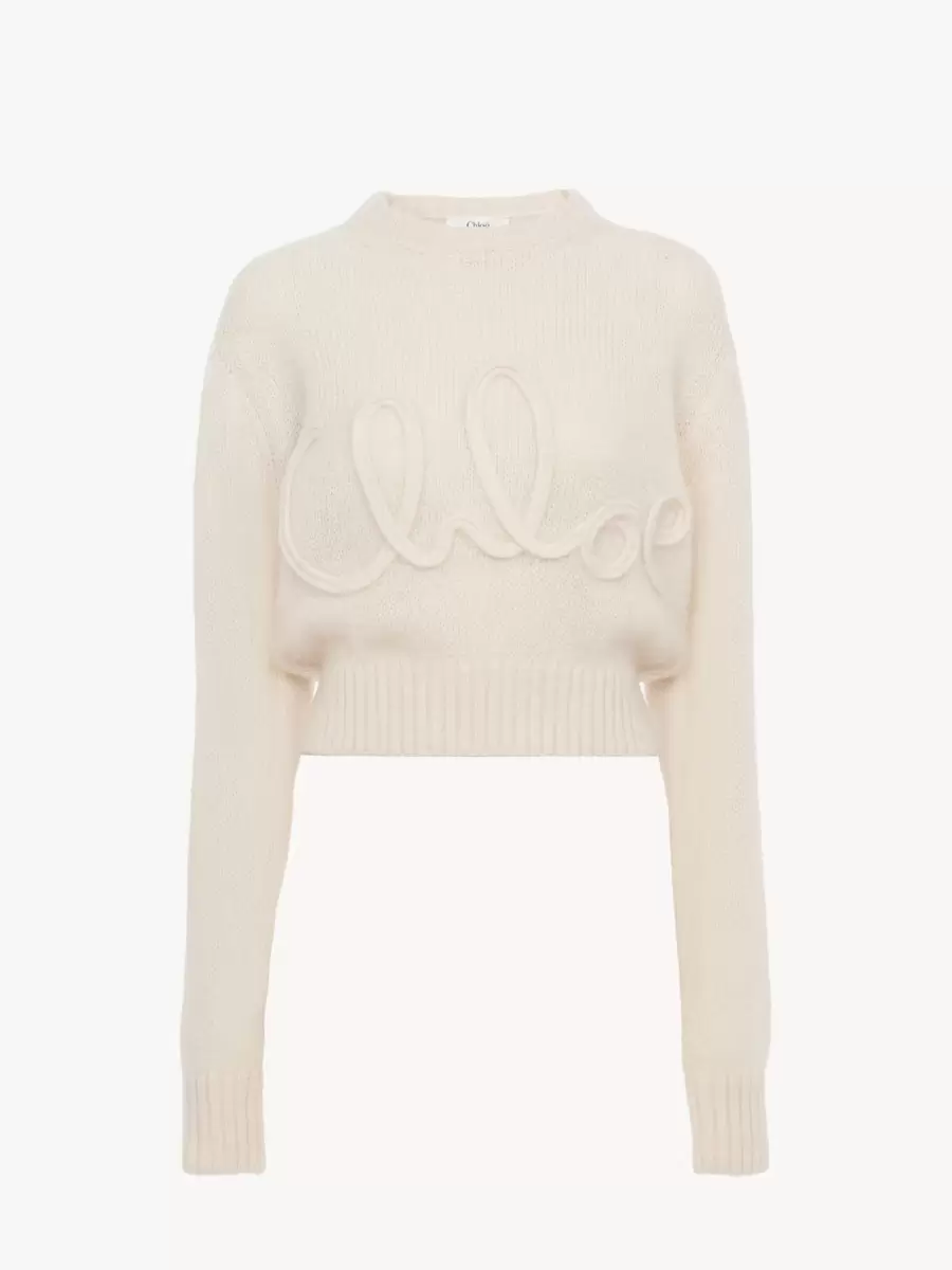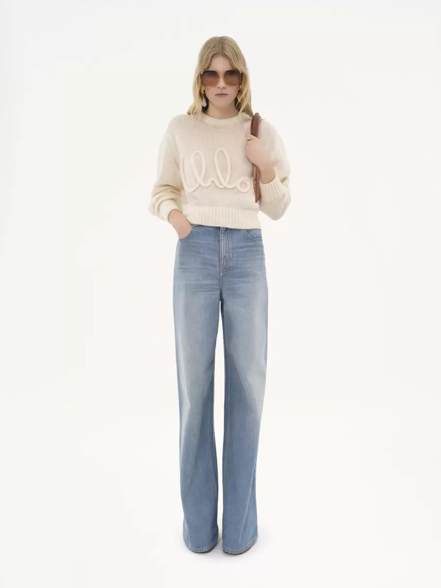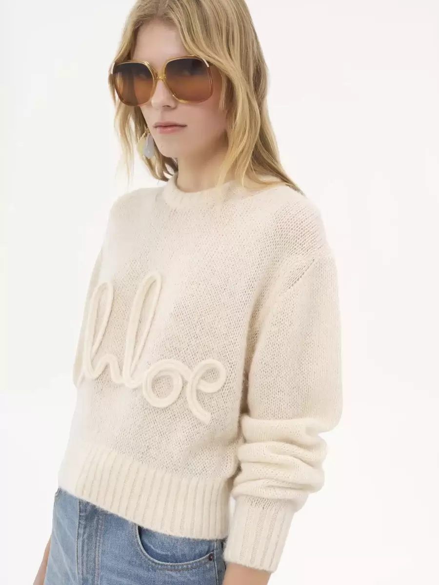 Alpaka yünü ve ipek örgüden yapılmış, yuvarlak yakalı kazak, ön kısmında nervürlü süslemeler ve büyük Chloé işlemeleriyle detaylandırılmıştır.