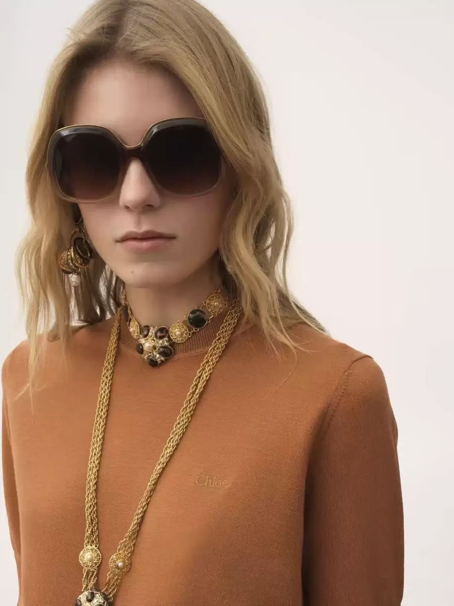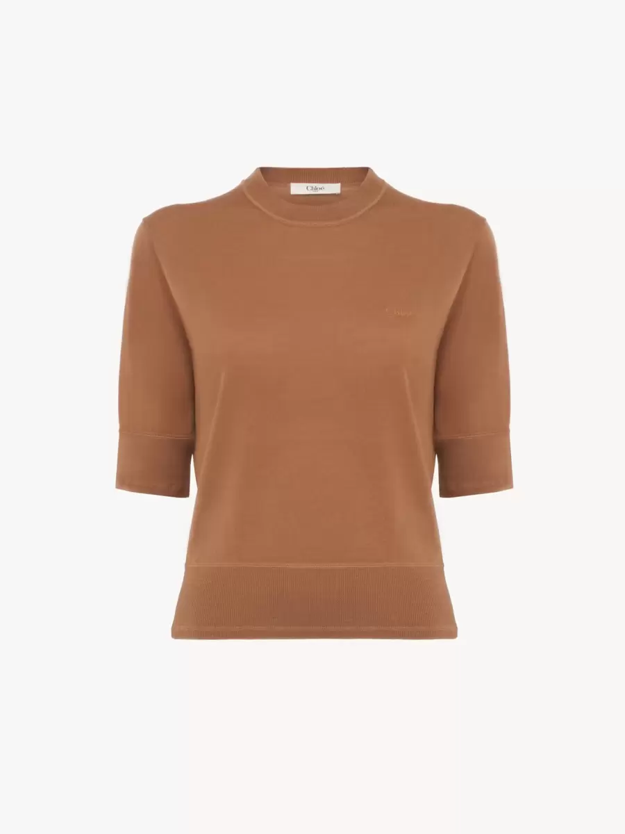 Düşük etkili ince merino örgüden kısa kollu kazak, göğüs kısmında nervürlü süslemeler ve ince Chloé logosu işlemesi ile.