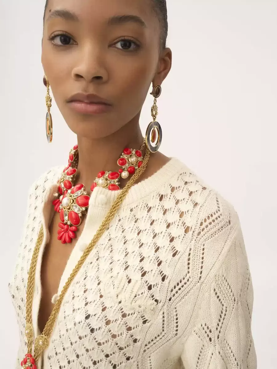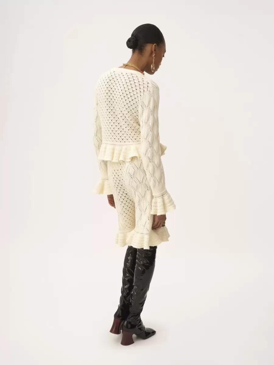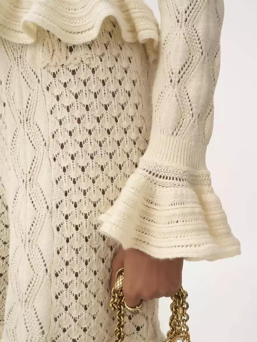 İpek, alpaka yünü ve pamuktan yapılmış, yuvarlak yakalı, kısa ve fırfırlı hırka. Fırfırlı etek ucu ve manşetleri var. Tonlu Chloé logosu işlemeleri ve ön taraftaki kumaş kaplı düğmeler bu parçayı tamamlıyor.