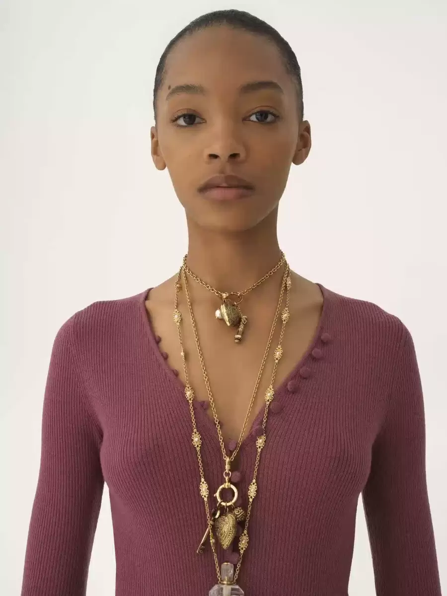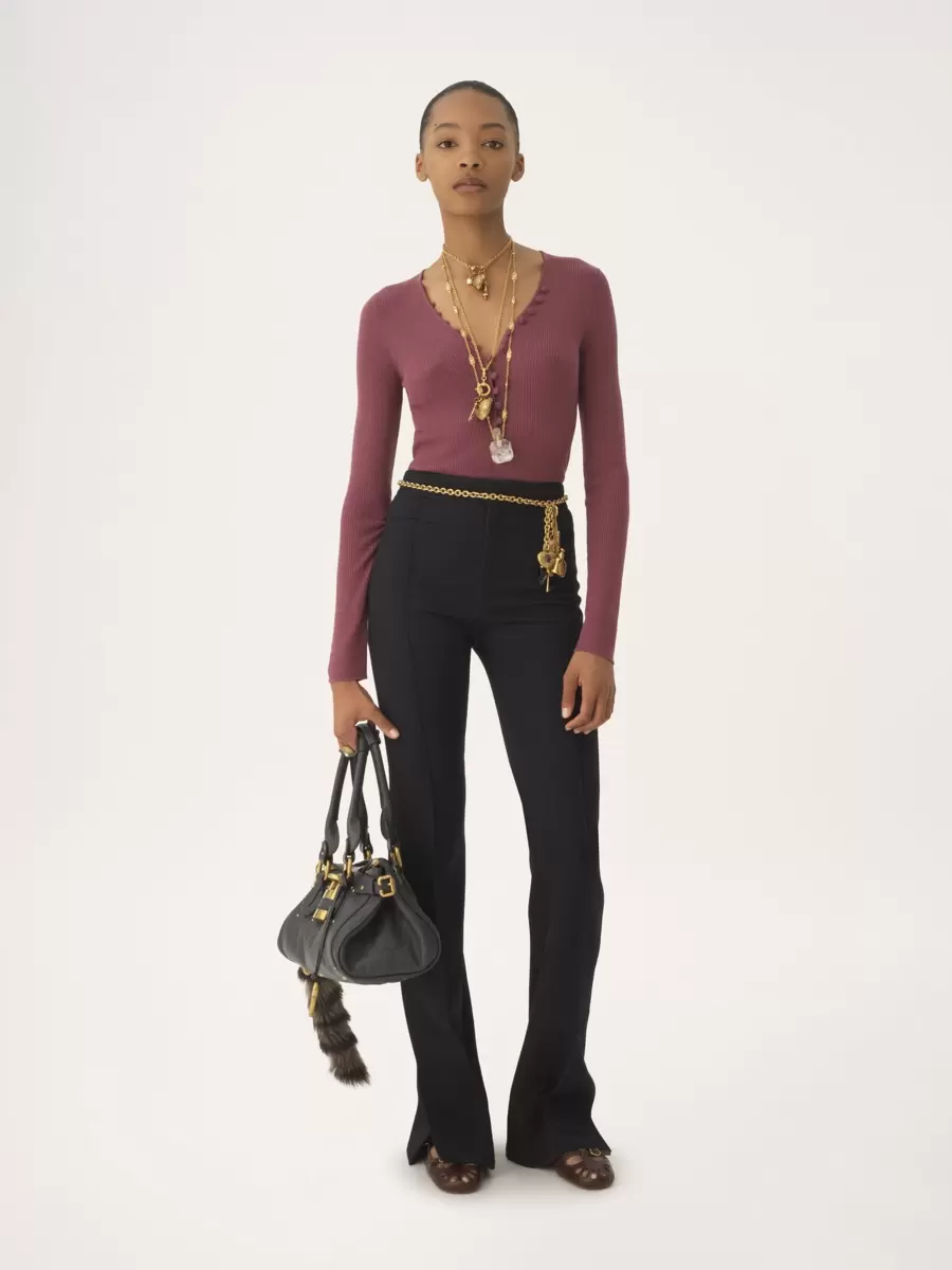 Düşük etkili merino yün örgüden yapılmış, V yakalı, dar kesim Henley gömlek. Kumaş kaplı düğmeler ve arkada barok “C” işlemesi bulunur.