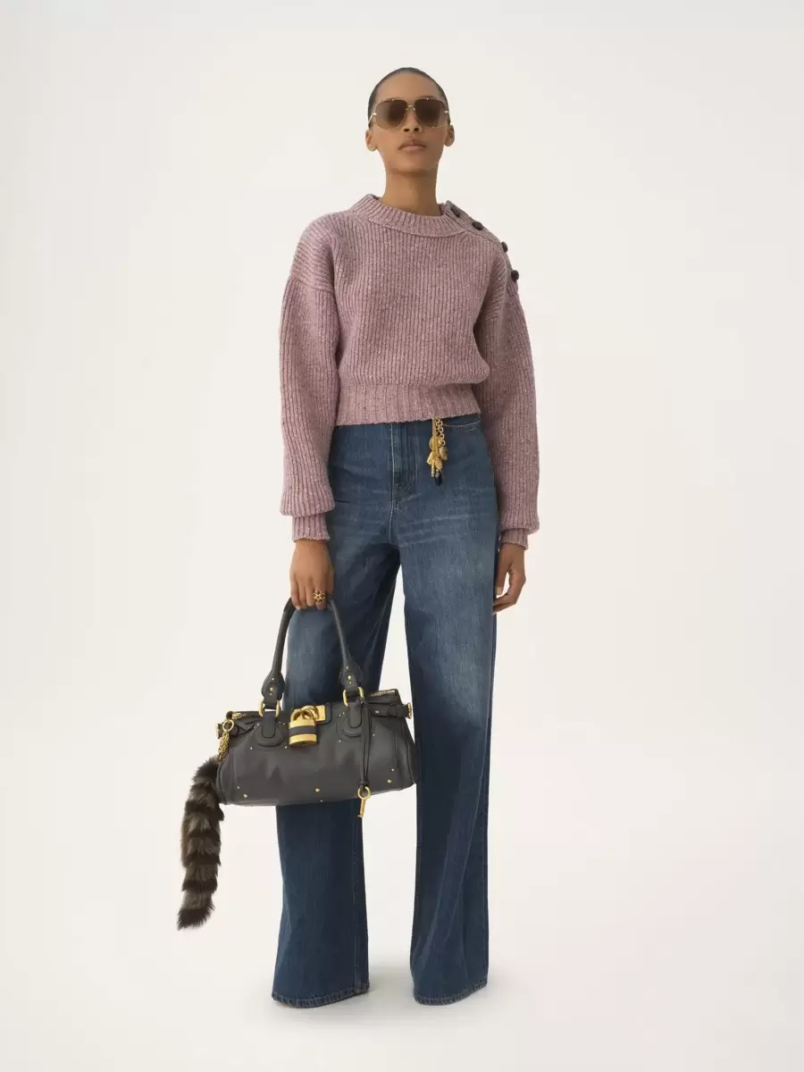 Sol omuzda parlak deri düğmeler ve nervürlü kenarlara sahip, Donegal yününden kısa balıkçı yaka kazak.