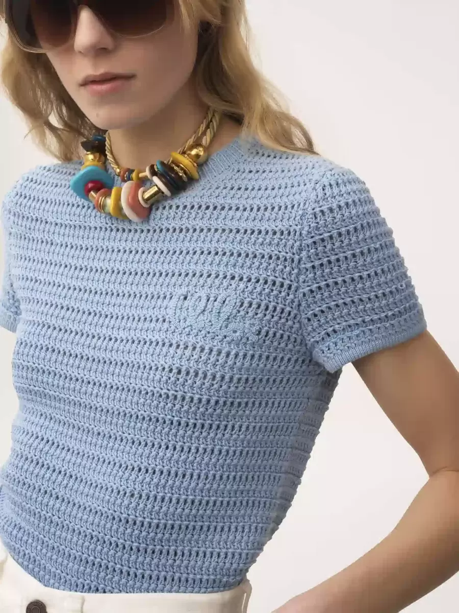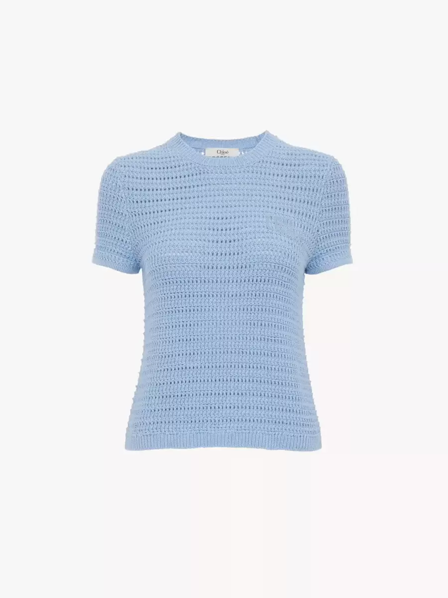 Göğüs kısmında Chloé logosu işlemeli, organik pamuklu tığ işi örgüden, vücuda oturan bisiklet yaka üst.