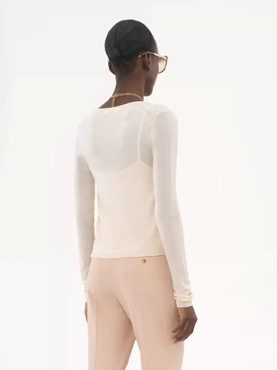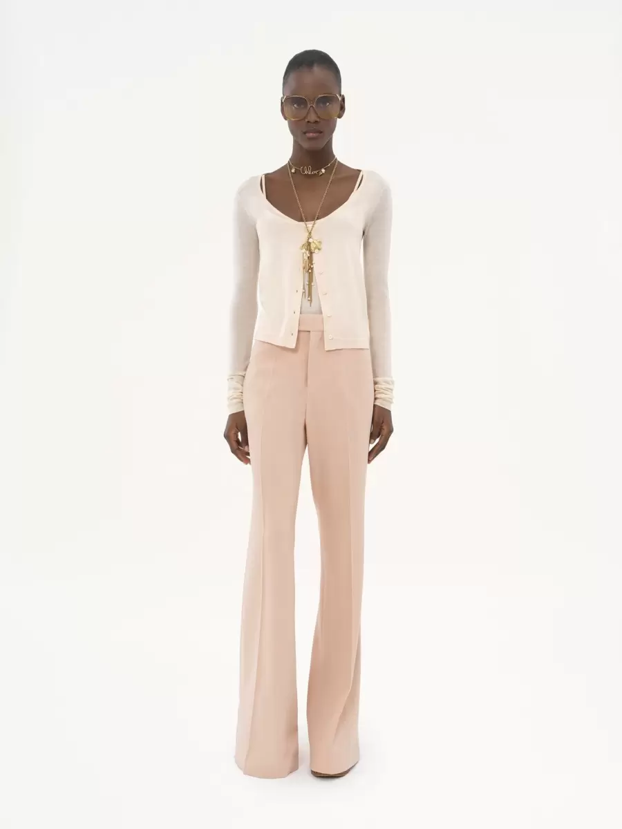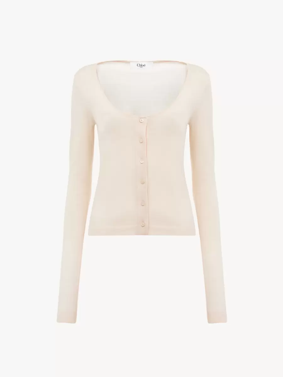 Ön kısmında sedef düğmeler ve sol kalçada tonlu Chloé logosu işlemesi bulunan, düşük etkili süper ince yünlü nervürlü örgüden, yuvarlak yakalı, vücuda oturan hırka.