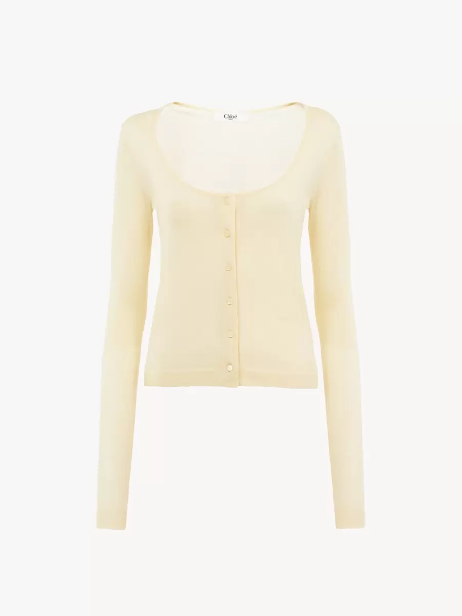 Ön kısmında sedef düğmeler ve sol kalçada tonlu Chloé logosu işlemesi bulunan, düşük etkili süper ince yünlü nervürlü örgüden, yuvarlak yakalı, vücuda oturan hırka.