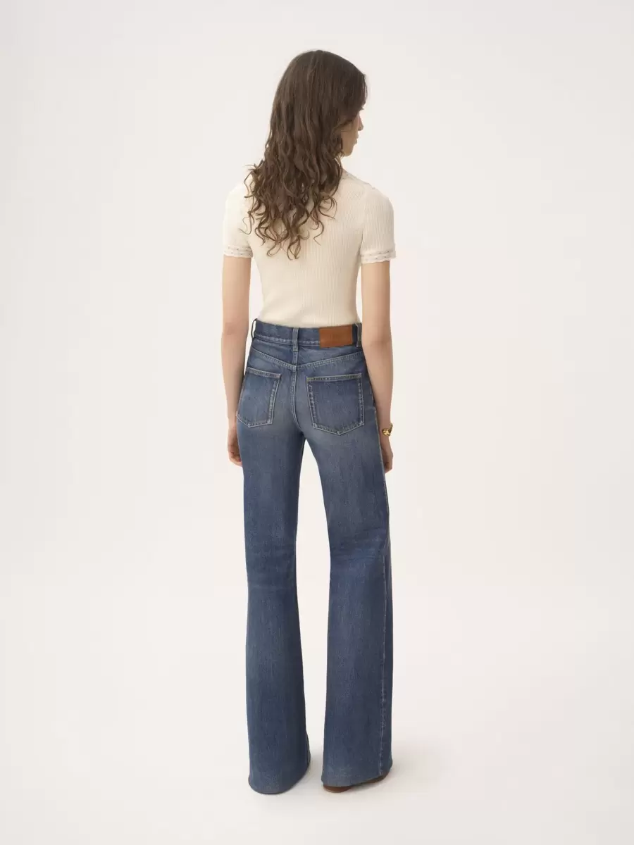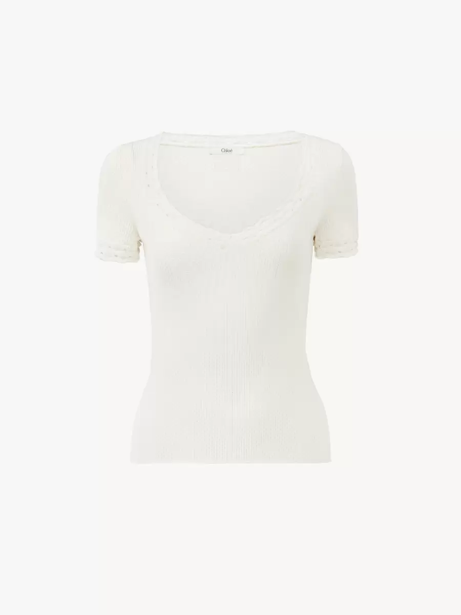 Dar darbeye dayanıklı, delikli yün örgüden, dantel süslemeli ve arkada zarif bir Chloé logosu yamalı, yuvarlak yakalı, vücuda oturan üst.