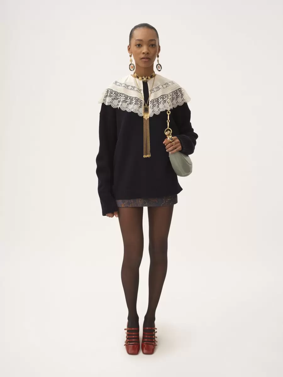 Yün ve kaşmir örgüden yapılmış, nervürlü süslemeler ve kol kısmında ince bir Chloé logosu yaması bulunan büyük boy kazak.