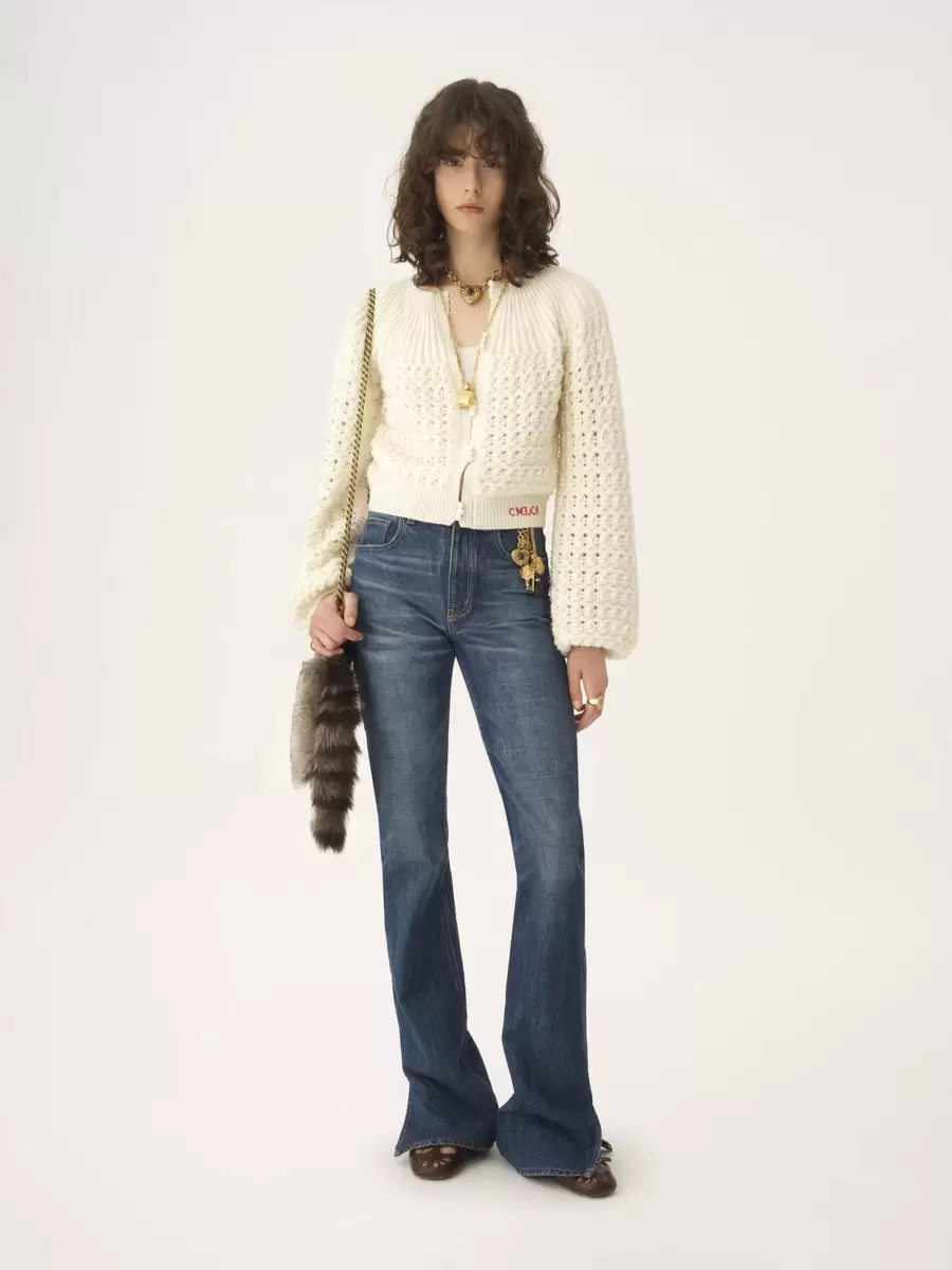 Düşük etkili kalın yün ve kaşmir örgüden yapılmış, geniş kollu, kumaş kaplı düğmeli, nervürlü kenarlı ve etek ucunda Chloé logosu işlemeli, yuvarlak yakalı hırka.