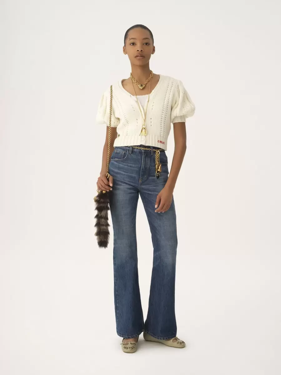 Düşük etkili kalın yün ve kaşmir örgüden V yakalı hırka, kısa kabarık kollar, kumaş kaplı düğmeler ve etek ucunda Chloé logosu işlemesi içerir.